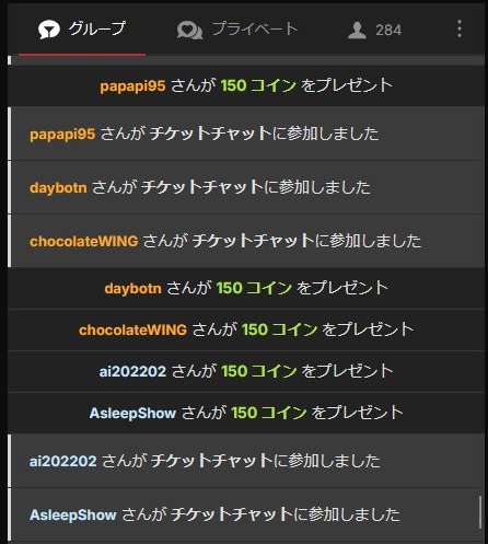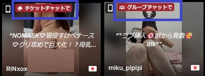 次に、参加自体が有料になるチャット形式として、チケットチャット(チケチャ) と グループチャット(グルチャ) があります。トップページやルーム内で「グループチャットで」「チケットチャットで」と表示されている場合、その配信は有料視聴(参加)になります。