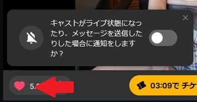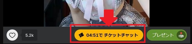 配信が進むと、画面下に「〇〇でチケットチャット」といった表示が入りカウントダウンが始まります。この数字がゼロになると有料ルームになります。