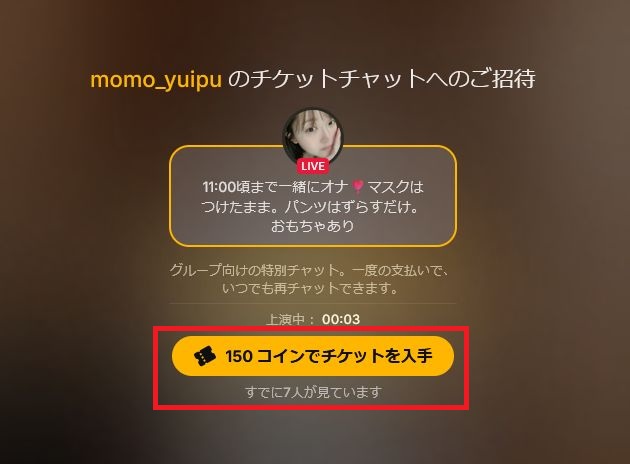 画面左上に「グループチャットで」「チケットチャット」での表示されていると有料での視聴となります。有料の内容はキャストが自由に決められるので、有料チャンネルを覗く前にまずは無料でどんなキャストが何をしているのか確認してから課金するようにしましょう。