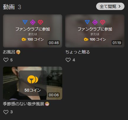 プロフィール画面からは過去の動画もコインを購入すればみることができます。